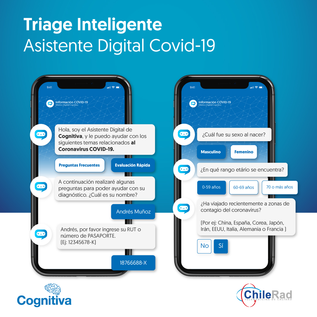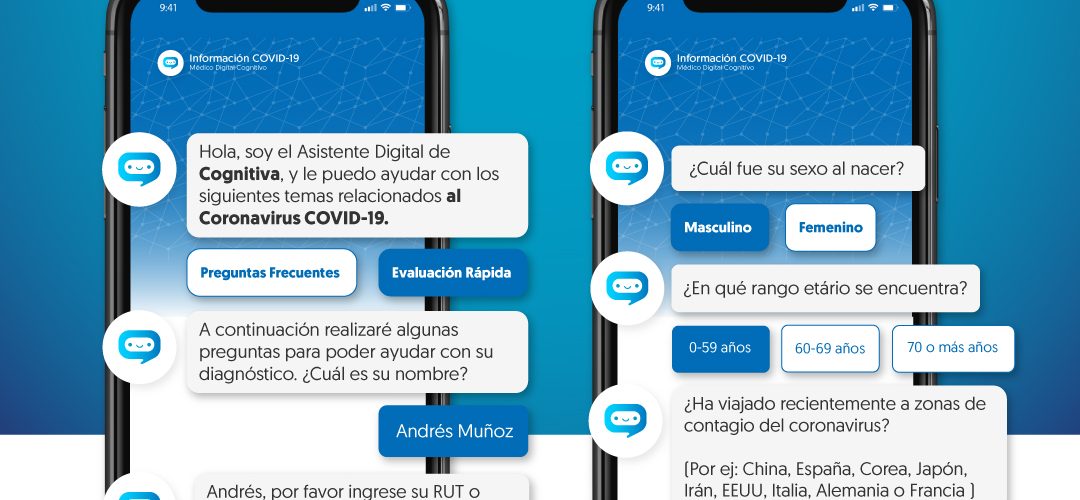 Aldo Marzolo, creador y General Manager de Cognitiva comenta: “trabajamos en un chatbot con IA el cual vía internet realiza un test rápido con preguntas para identificar si las personas presentan los síntomas del COVID-19. El test se encuentra habilitado para el uso público en el sitio web de cognitiva. La idea es que la aplicación se convierta en una herramienta digital que ayude a desconcentrar de tumultos los centros de emergencia y de salud, que evite la aglomeración y la movilidad de personas al tiempo para priorizar la atención a los casos urgentes”