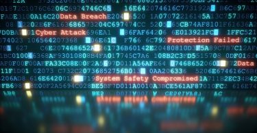 A close-up on an abstract design of a display, which is warning about a cyber attack. Multiple rows of hexadecimal code are interrupted by red glowing warning text. Part of the display is reflected on a shiny surface. The image can represent a variety of threats in the digital world: data theft, data leak, security breach, intrusion, etc…