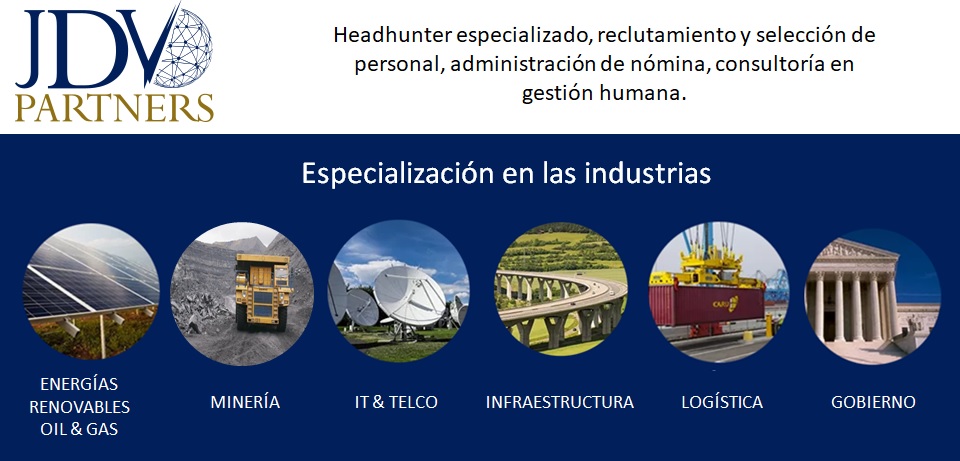 COLOMBIA (Agosto 10 de 2020).      JDV Partners, headhunter con más de 30 años de experticia conjunta entre los socios en reclutamiento y selección de personal, administración de nómina y consultoría en gestión humana, especializado en las industrias de Energías Renovables – Oil & Gas, Minería, Tecnologías de Información y Telecomunicaciones, Infraestructura y Construcción, Logística y Gobierno en Colombia, España, Alemania y países en Latinoamérica como Panamá, Perú, México, Ecuador y Argentina, entre otros.