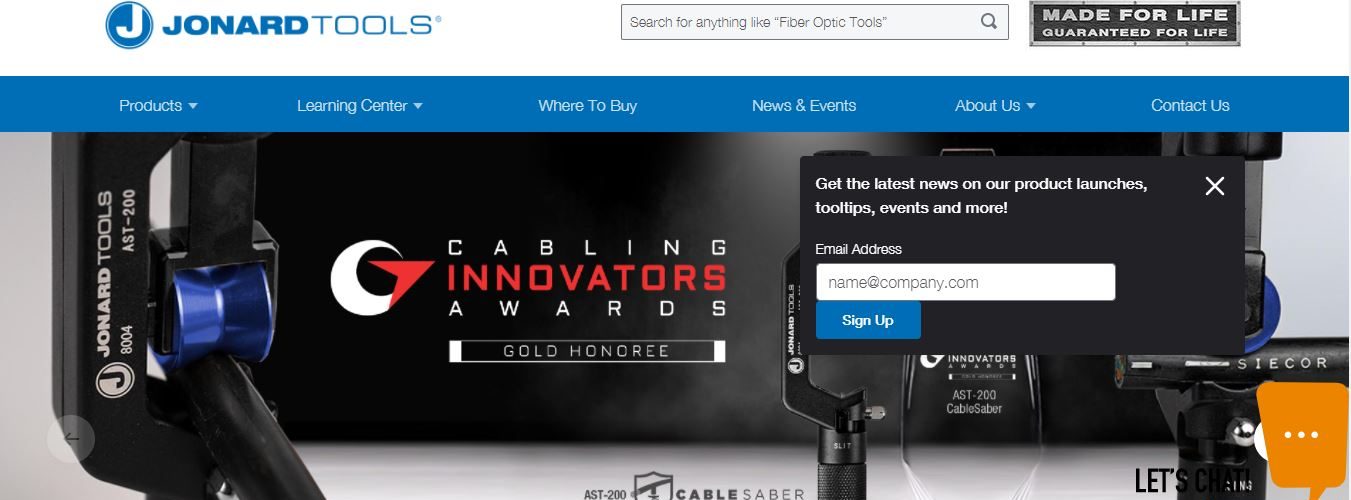 Jonard Tools es el mayor fabricante de herramientas de fibra óptica, incluida la galardonada cortadora de tramo medio (MS-6), la línea de herramientas de corte y anillo de tramo medio de doble función, el QuickSleever® (PSI-15) y, más recientemente, el cableSaber (AST-200).