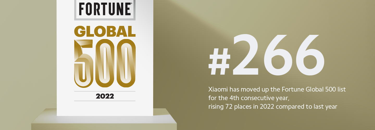 • El grupo Xiaomi ocupó el puesto 266 en la lista Fortune Global 500 2022, la cual fue publicada el pasado 3 de agosto. La compañía global de tecnología y tercer fabricante de Smartphones más grande del mundo, ascendió en la lista por cuarto año consecutivo.